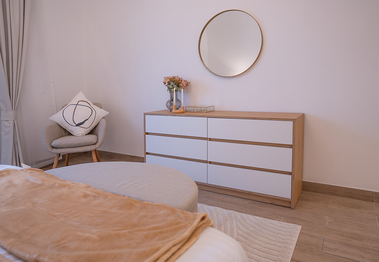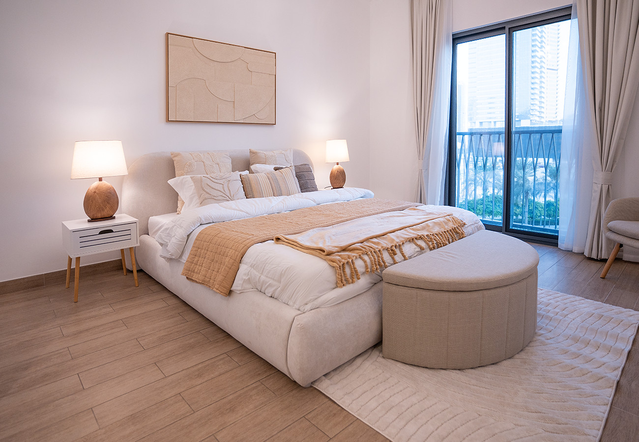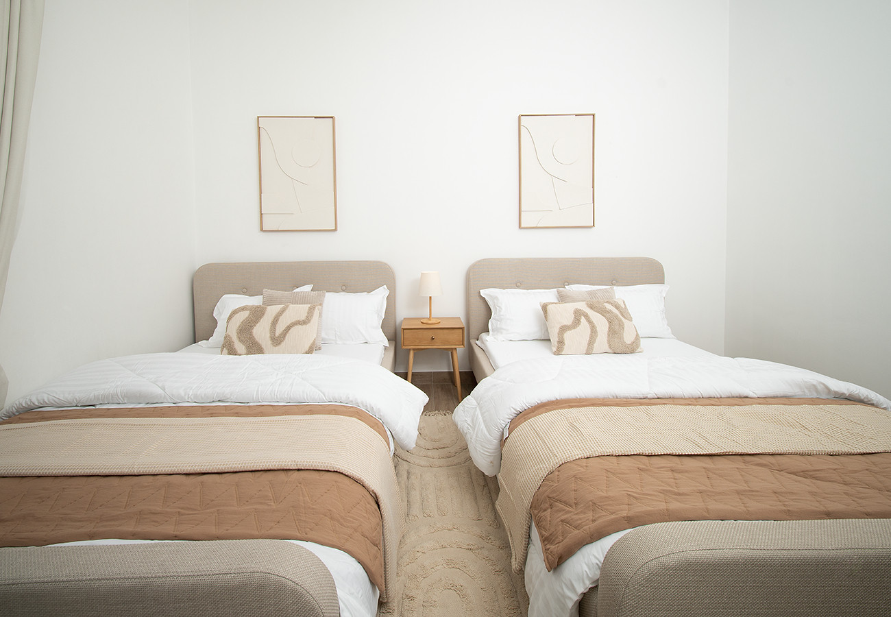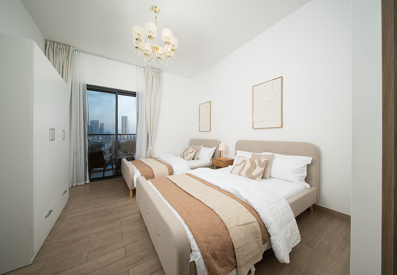 A modern 2-bed apartment in Cyan Beach Residence featuring a king-size bed in the master room and two single beds in the second room. Enjoy bright interiors, stylish furnishings, and an open-plan living area perfect for relaxing. The fully equipped kitchen and private balcony add comfort and convenience. Just steps from the beach and offering premium amenities, this apartment provides a welcoming stay for families and groups alike.